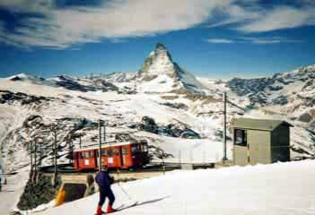 さあお待たせしました、ゲレンデへ出てみましょう!! まずゲレンデマップをごらんください。最初は登山電車でゴルナーグラッドへ向かいます。できれば右側の座席に座りましょう。電車が登っていくにつれ、ツェルマットの町が眼下になり、アルプスの雄大な眺めが見えてきます。